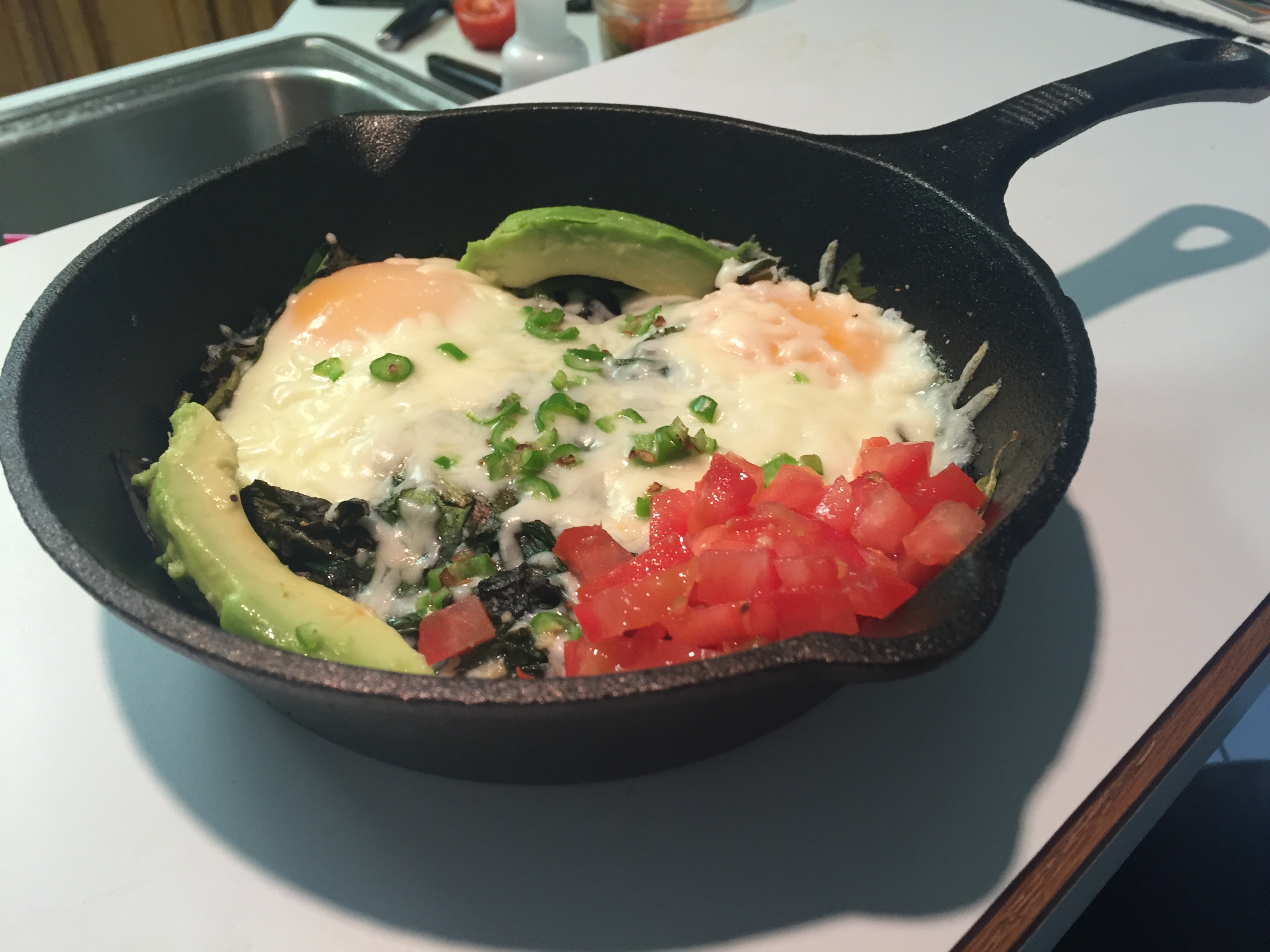 espolvorear el queso mozzarella sobre los huevos. Meterlo nuevamente al horno por otros 2 o 3 minutos para que gratine el queso. - Sazonar con sal y pimienta, decorar con el tomate, aguacate y chile serrano. ¡LISTO!
