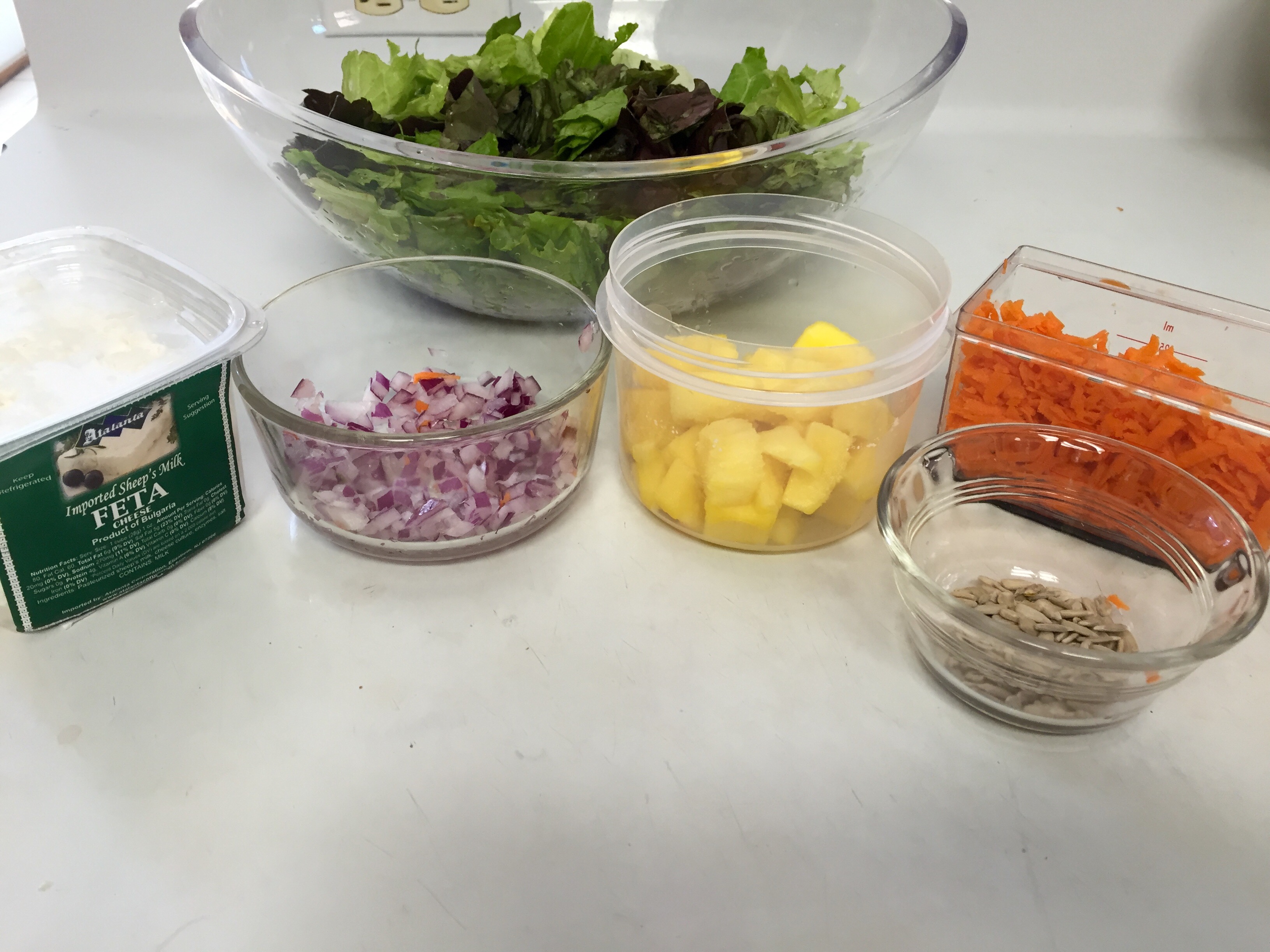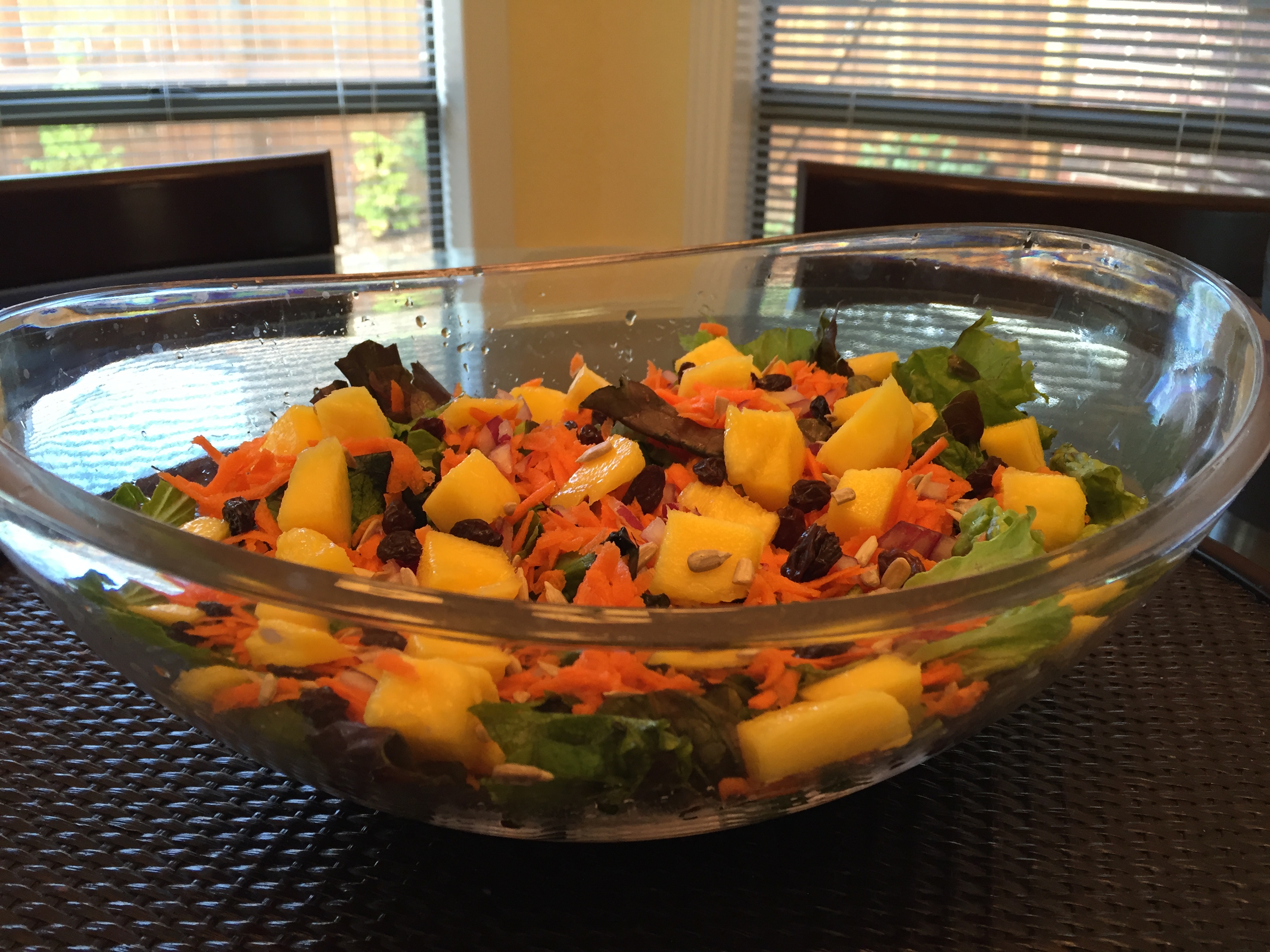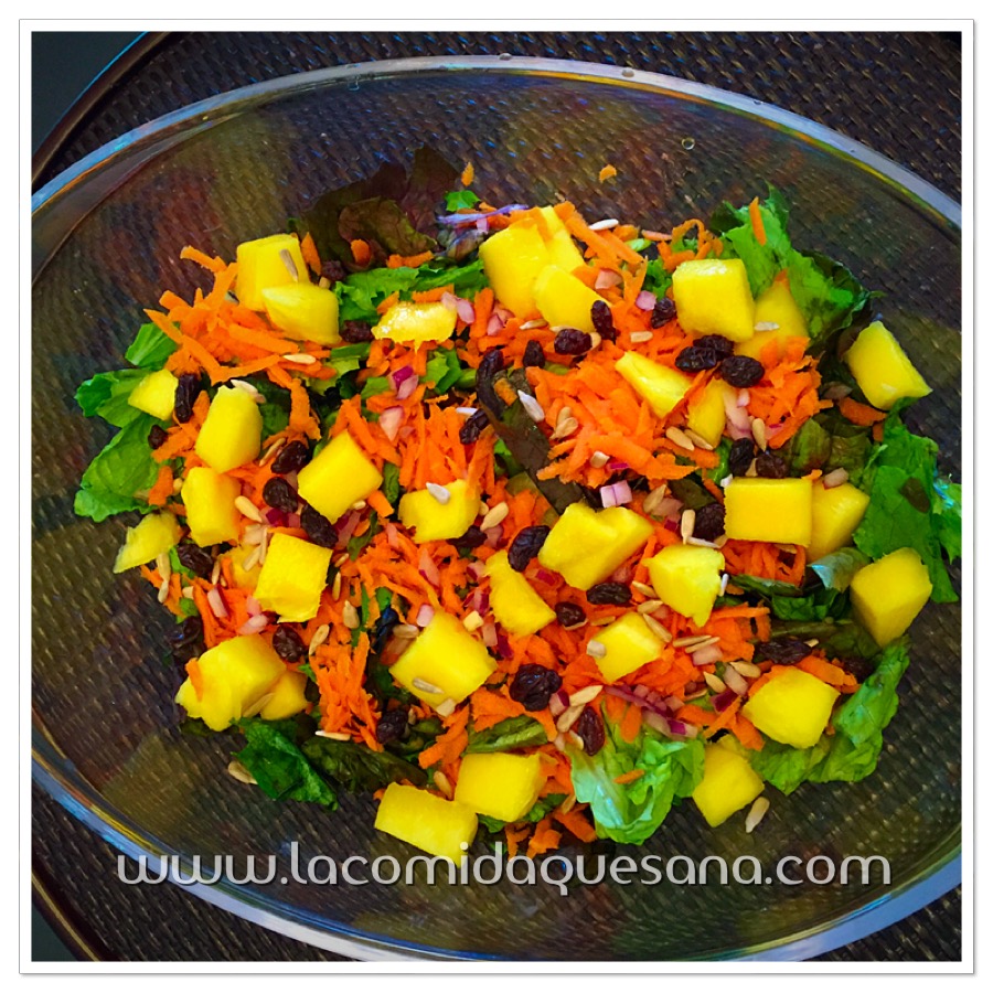 Hoy nos aventuramos con esta variedad de ensalada que se me ocurrió. La combinación de frutas y vegetales sigue siendo la opción que nos hace querer más ensaladas. ¡Yumi! La zanahoria en combinación con los trozos de mango y las pasas se sacó un diez. Bueno, esa es mi opinión 😉
