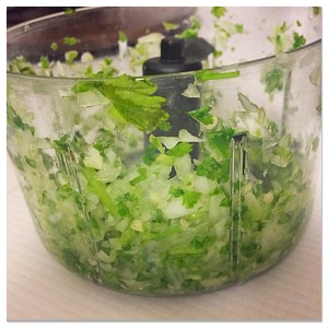 2. Picar finamente la cebolla, el cilantro, los dientes de ajo y chiles serranos y poner todo esto en un contenedor de plástico. Yo utilicé un procesador para este paso y lo piqué todo al mismo tiempo.