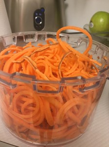 Mi comensal favorito no se sorprende cuando me encuentra preparando cosas «fuera de lo normal». Finalmente comer camotes en forma de espagueti es una novedad más, experimentos míos que recibe con buena actitud sobre todo cuando tiene hambre ja ja ja… 😀
