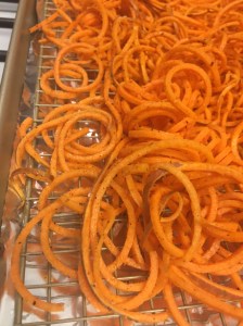 2. Proceder a cortar los camotes utilizando un cortador de verduras en espiral. (Yo no tengo el cortador para papas fritas, así que utilicé el de fideos; sin embargo, tú puedes utilizar el que tengas a mano y definir el grosor que mejor prefieras).