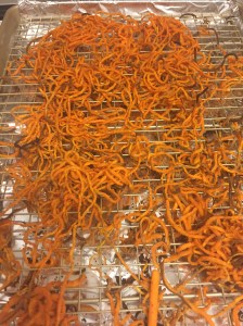 5. Colocar los fideos de camote ya sazonados, sobre una charola para hornear. (Es recomendable que la charola tenga una rejilla para enfriar reposteria ya que esto permitirá que el calor fluya por debajo de los fideos y por encima de estos, facilitando que queden todos bien crujientes).